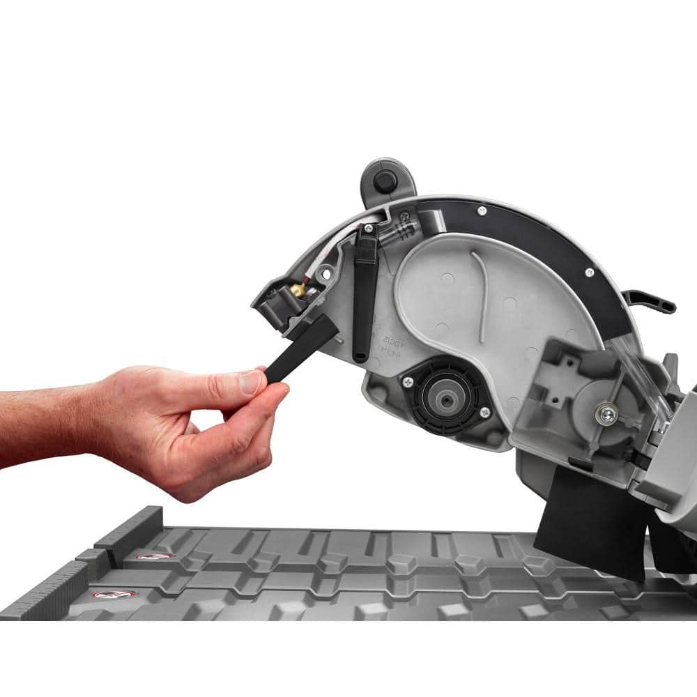 RIDGID introduces the 9 Amp 7 in. Job Site Wet Tile Saw with stand included. This is the most affordable pro tile saw on the market. This saw is upgraded from the previous model giving you a higher performance table system with 80% less water spray for faster clean up. Its powerful 9 Amp, 1-3/4 HP motor, best-in-class cutting capacities, die cast aluminum table and heavy-duty arm all come standard on this saw. Every feature on this saw is innovative and the definition of quality for a pro tile saw. The Deep Well Wave Wall will extend the life of your pump and the removable water nozzles maximize water efficiency to the blade while cutting. All of these amazing features are backed by the RIDGID Industry Leading Lifetime Service Agreement. That means FREE Parts. FREE Service. For LIFE. The 9 Amp 7 in. Job Site Wet Tile Saw includes a stand, a 7 in. blade, and an operator's manual.