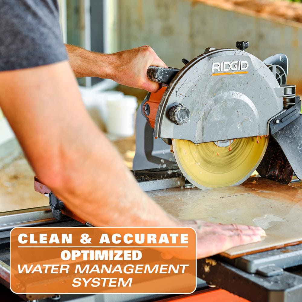 RIDGID introduces R4093 The Beast 10 in. Wet Tile Saw. This saw features a 36 in. rip capacity, 24 in. diagonal cutting capacity, and a 3-1/2 in. depth of cut integrated onto a machined roller system which provides cleaner, more accurate cuts. The RIDGID 10 in. Wet Tile Saw also features a unique drop gate design which delivers unlimited rip cut capacity on plank and large format tile. The versatile overhead blade design can bevel to 22.5° or 45° and can also make plunge cuts for electrical boxes and HVAC registers. Additionally, this saw offers several water management features like optimized water nozzles for clean cuts, efficient splash guards that reduce refills, and water tray isolation walls which increase pump life by separating debris out of the recirculated water. The onboard accessory storage and large integrated wheels on the mobile stand make transporting the 10. Wet Tile Saw to the next job very easy. Best of all, this tool is backed by the Industry’s Best Lifetime Service Agreement, simply register within 90 days of purchase for FREE Parts, FREE Service, FOR LIFE. The R4093 includes the 10 in. Wet Tile Saw, Mobile Stand Assembly, 10 in. diamond cutting wheel, rip fence, miter guide, support arm, (2) splash guards, water pump with filter, cutting wheel wrench, assembly hardware, and operator’s manual.