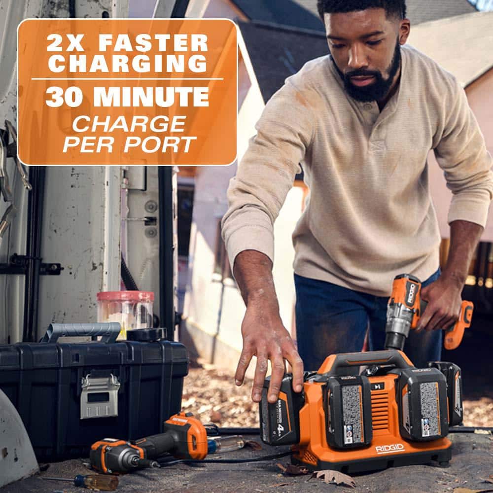 RIDGID introduces the AC86096 18V 6-Port Sequential Charger. This charger can charge any six RIDGID 18V batteries one at a time. The RIDGID 6-Port Sequential Charger delivers a 2x faster charge time compared to the R86093 18V Charger, charging a 2.0 Ah lithium-ion battery in just 30 minutes. The charger is equipped with a convenient carrying handle for easy transportation as well as an integrated pass-through plug to optimize outlet space. The 6-Port Sequential Charger features a battery port selector, allowing users to choose which battery to charge on command. As always, this RIDGID 18V 6-Port Sequential Charger is 100% compatible with all RIDGID 18V batteries. Best of all, this charger is eligible for the Industry's Best Lifetime Service Agreement, simply register within 90 days of purchase for FREE Parts, FREE Service, For LIFE. Batteries sold separately.