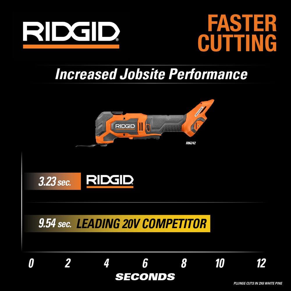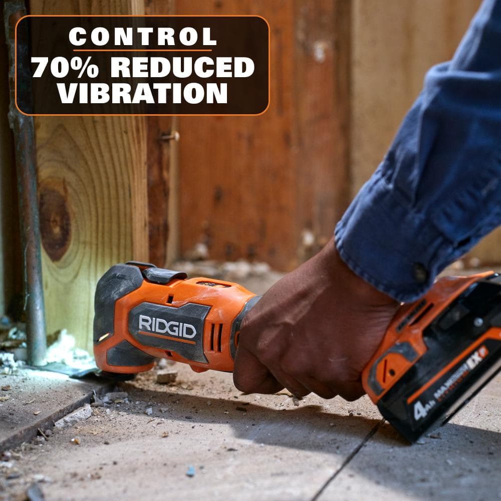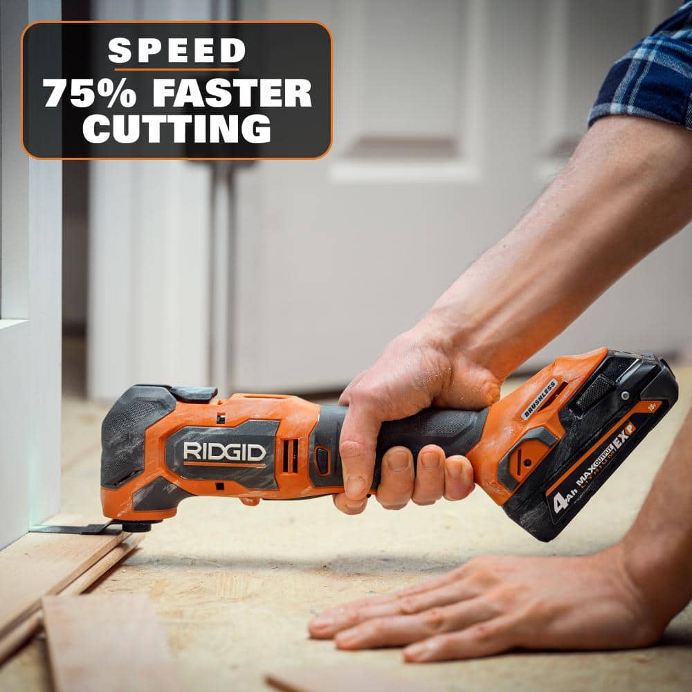 The RIDGID 18V Brushless Oscillating Multi-Tool delivers the power to complete a variety of high demand jobsite applications. Confidently cut through hardwood and nail embedded wood with RIDGID’s brushless motor technology, delivering maximum performance and longer runtime. Achieve up to 75% faster cutting with a 4° oscillation angle and speeds ranging from 0-20,000 OPM. This multi-tool offers 70% reduced vibration for greater control, accuracy, and comfort during demanding jobs. The three-speed selector and variable-speed trigger allow you to enhance your control to match the speed to any application. Seamlessly swap accessories with the tool-free accessory change so you can move from one task to the next with ease. Perform detailed work and maneuver in confined areas as this oscillating multi-tool is designed with a 10% more compact head. As always, this RIDGID 18V Brushless Oscillating Multi-Tool is 100% compatible with all RIDGID 18V batteries. This tool is backed by the Industry’s Best Lifetime Service Agreement, simply register within 90 days of purchase for FREE Parts, FREE Service, FOR LIFE. The R86242B includes the 18V Brushless Oscillating Multi-Tool, sanding pad, sandpaper, segment blade, and plunge cut blade. Battery and charger sold separately.