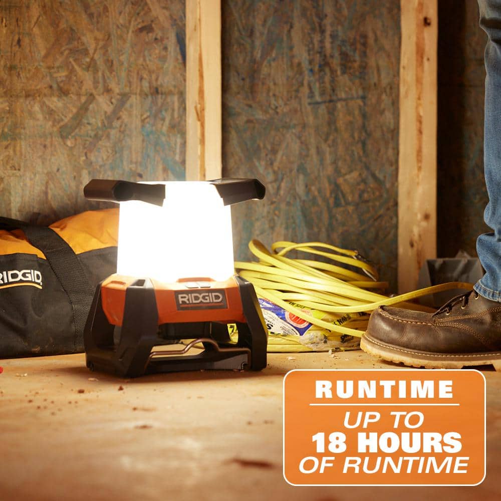 The RIDGID R86903 18V 360° LED Area Light delivers 2,000 lumens from clear white LEDs to illuminate your area. RIDGID Clear White LEDs consistently provide clear white light providing users visibility of fine details and accurate colors. The area light features three brightness settings with three directional modes with up to 18 hours of runtime on low setting (using an AC840060 18V 6.0Ah MAX Output Battery). Built for the everyday jobsite conditions, this durable light is IP54 rated water and dust resistant. For optimized user control and versatility, this tool can provide 360°, 180° (front only), or 180° (rear only) illumination. For hands free operation, the area light can be hung from its integrated hanging hook or mounted on universal tripod stands (1/4 in.-20 thread). The USB-A and USB-C charging ports allow you to charge your small mobile devices anywhere you go. As always, this RIDGID 18V 360° LED Area Light is 100% compatible with all RIDGID 18V batteries. This tool is backed by the Industry’s Best Lifetime Service Agreement, simply register within 90 days of purchase for FREE Parts, FREE Service, FOR LIFE. The R86903 includes the 360° LED Area Light. Batteries and charger sold separately.